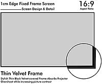 184" Silver pro Micro Perforated 1cm Edge Frame Screen with Aspect Ratio : HDTV 16:9; Viewing Area : 90 X 160 (inch);Black Velvet & Slim Frame; Ultra high definition image & wide angle viewing angle.